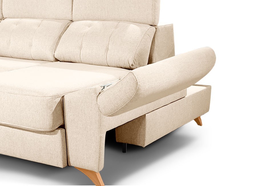 Sofá con asientos deslizantes a suelo con pata alta y brazos móviles con arcón